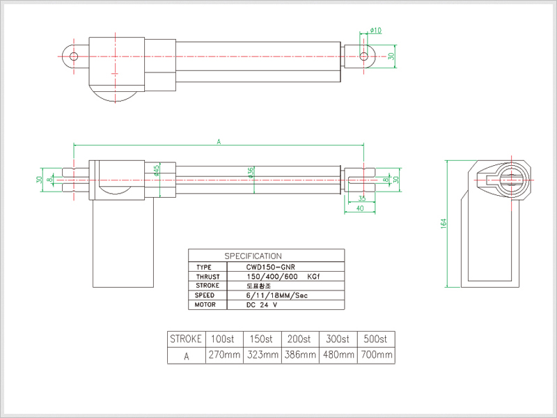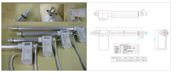 상품 상세설명제품의 특징 - 소형 전동실린더로 150Kg.f의 추력 - 복잡한 유,공압을 간단한 전동실린더로 대체 - 저소음으로 리미트 스위치가 내장되어 있어 STROKE이상 벗어날 시 자동정지 - 유지 및 보수의 편리성 - 적용분야 : 의료기기, 실버용품(전동의자, 침대등), 자동도어, 자동주차시설 등 폭넓은 사용범위 ※ 참고 : 파워실린더는 추력과 속도가 반비례합니다. 주의!! 도면을 다운 받아 작도 시 본사에 재고 유무를 필히 확인 하여 주시기 바랍니다. ![]() ![]() |